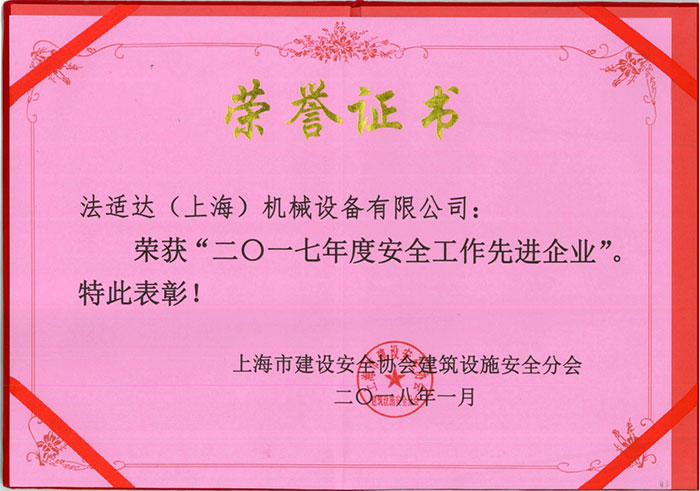 榮獲市“2017年度安全工作先進(jìn)企業(yè)” 時(shí) 間:2018-01-18 22:10:43 瀏覽次數(shù):7310 法適達(dá)榮獲由上海市建設(shè)安全協(xié)會(huì)建筑設(shè)施安全分會(huì)頒發(fā)的“2017年度安全工作先進(jìn)企業(yè)”。