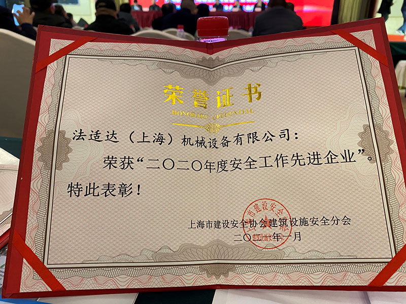 法適達(dá)公司榮獲上海市建設(shè)安全協(xié)會建筑設(shè)施安全分會頒發(fā)的安全工作先進(jìn)企業(yè)以及個人先進(jìn)。
