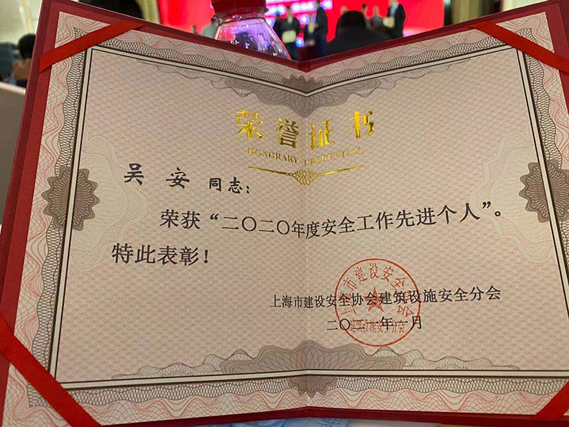 法適達(dá)公司榮獲上海市建設(shè)安全協(xié)會建筑設(shè)施安全分會頒發(fā)的安全工作先進(jìn)企業(yè)以及個人先進(jìn)